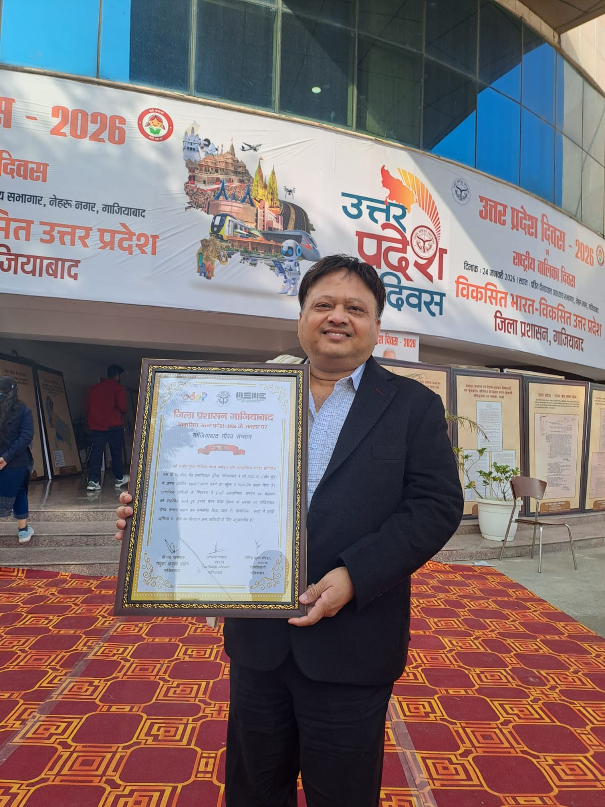 The award was presented by Honorable Shri Narendra Kashyap Ji, Minister of State (Independent Charge), Backward Classes and Empowerment of Persons with Disabilities Department, Government of Uttar Pradesh, in the presence of Honorable MLA Shri Sanjeev Sharma Ji, Honorable Loni MLA Shri Nand Kishor Gurjar Ji, Honorable MLA Smt. Manju Shivach Ji, and District Magistrate Shri Ravindra Kumar Mandar Ji (IAS).
