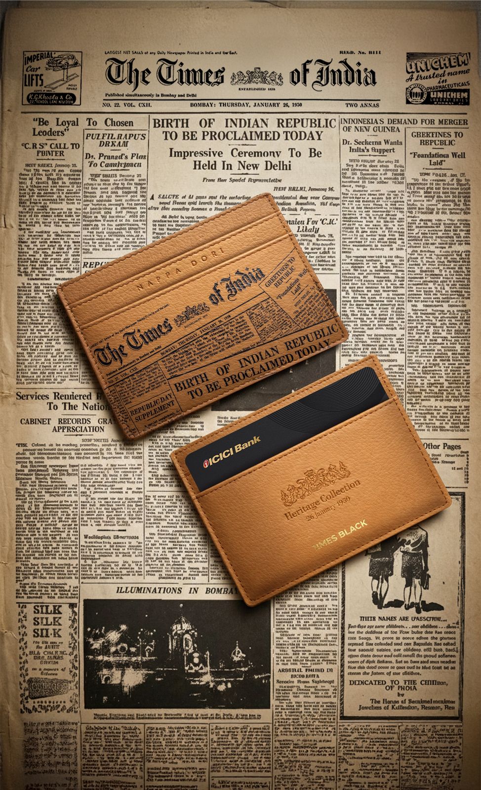 New Delhi, India Jan 23: The Times Black ICICI Bank Credit Card, in collaboration with Nappa Dori, today introduced a limited-edition Archival Card Holder. The piece features a print of the original 26 January 1950 edition of The Times of India, commemorating the day India became a Republic.