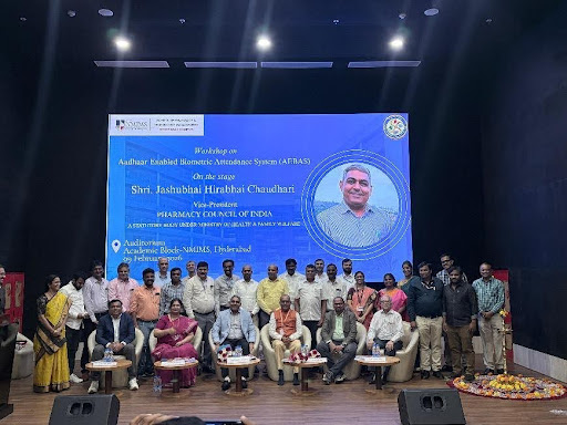 A workshop on the implementation of the Aadhar Enabled Biometric Attendance System (AEBAS) was successfully conducted by the Pharmacy Council of India (PCI) on 9th February at SVKM’s NMIMS-Deemed to be University, School of Pharmacy and Technology Management, Jadcherla. The programme commenced with an inaugural session at 10:30 AM, which included the traditional lighting of the lamp, symbolizing the beginning of an insightful and knowledge-driven event. The workshop aimed to orient pharmacy institutions toward the adoption of AEBAS in order to enhance transparency, accountability, and regulatory compliance in attendance management.