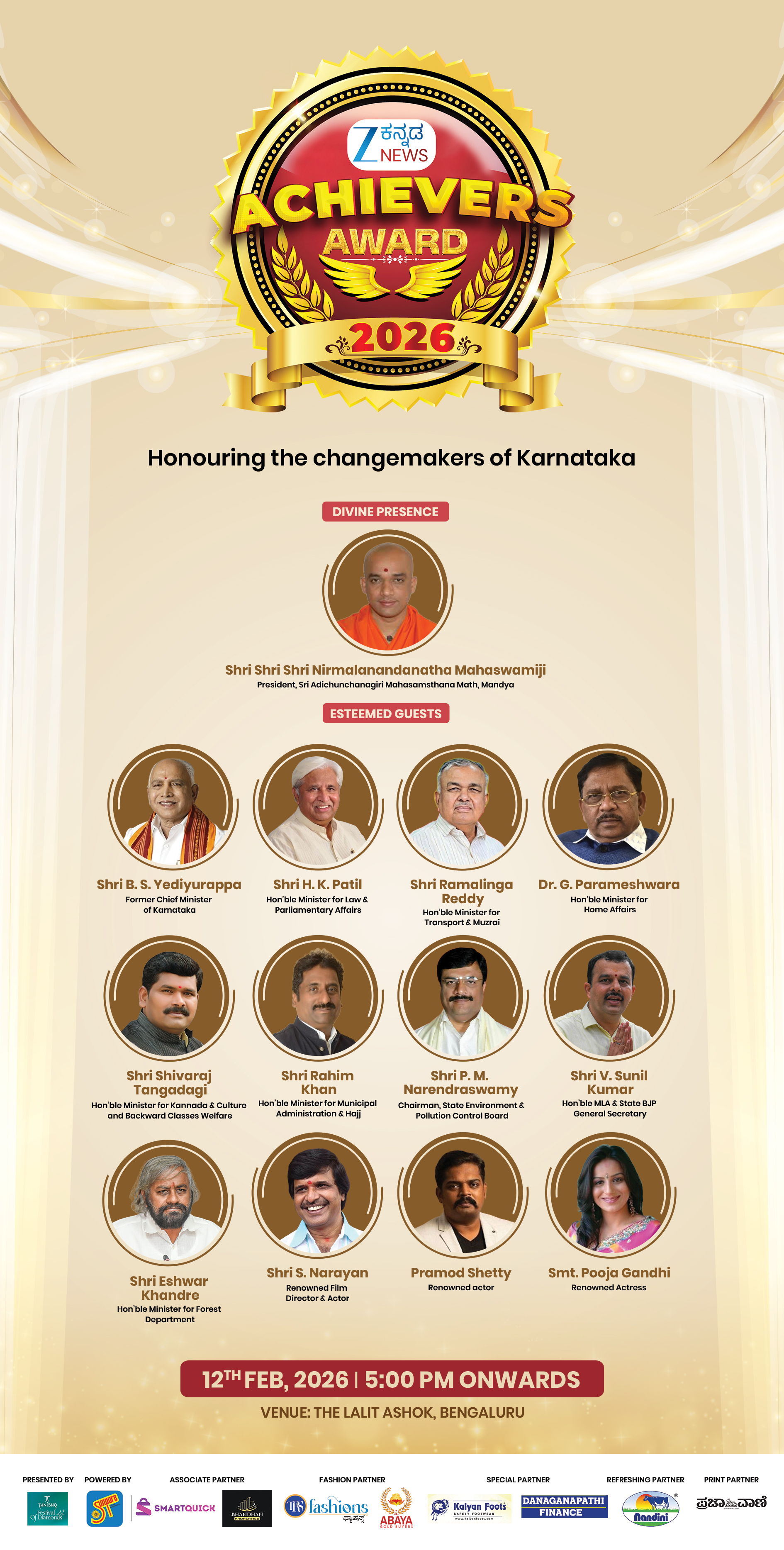 The ZEE Kannada News Achievers Awards 2026 will also confer the Lifetime Achievement distinction upon individuals whose decades of contribution have left a lasting imprint on Karnataka and beyond. The recognition this year will be accorded to Shri B. S. Yediyurappa, Former Chief Minister of Karnataka, for his enduring role in public life and governance; to Shri S. Narayan, Director, Actor and Producer, for his sustained contributions to Kannada cinema; to Shri Anke Gowda M., Book Lover and Librarian, for his commitment to fostering literary culture and access to knowledge; and to Ms. Chitra Magimairaj, International Snooker Player, for her accomplishments in representing India on the international sporting stage. The segment reflects a collective acknowledgment of legacies built over time through leadership, creativity, and perseverance.